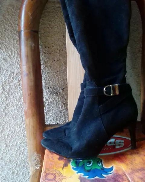 Botas de gamuza altas,con tacón de aguja ,con detalle de candado pequeño en ambas botas,marca Calvin Klein