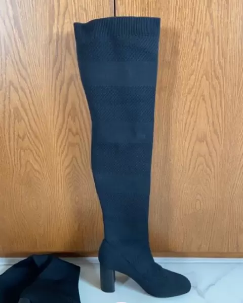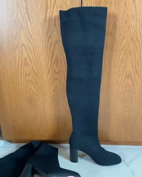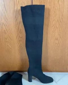 Botas altas. Botas arriba de la rodilla, con tacón ancho y alto de 8 centímetros, se pueden usar con faldas y con pantalones, comidas para caminar ya que la tela es elástica y se adapta al pie, no aprietan para nada.