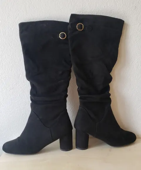 Botas altas con cierre, traen un cinturón en la parte alta como detalle, tipo gamuza, tacon mediano de 7cm, talla #6