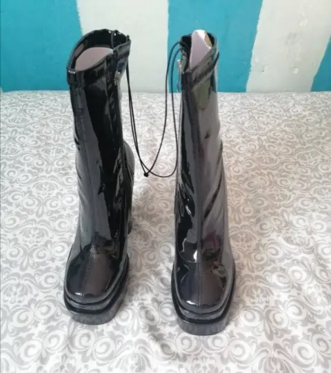 Botas de plataforma color negro, corte tipo charol. Nuevas. Altura de 14 cm. Traen su cubre polvo. Talla 24Marca Belinda