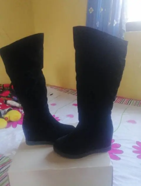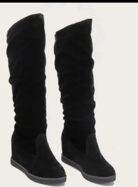 Botas de cuña gamuza. Botas de cuña color negro. Material:gamuza negra. Talla 22.5, pero vienen un poco amplias por lo que real queda a talla 23.Altura cuña 7 cm.Largo total. 42 cm