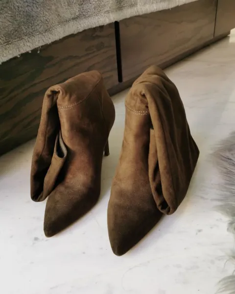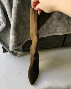 Botas de gamuza color verde olivo. La foto hace que se vean café, pero son verde olivo. Tacón de 8 cm. Número 6.5 americano de dama.