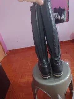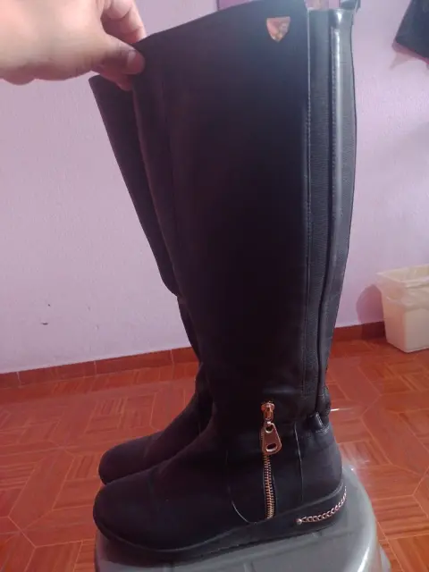 Botas de tubo largas con cierre aun costado y tienen un poco de licra para que se ajusten,en la parte de la suela tiene una pequeña cadena en dorado