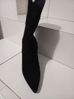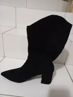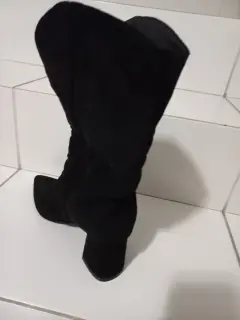 Botas del No. 5. Forradas en tela, simulan gamuza. Son del No. 5 pero quedan a No. 4. No traen ziper entran a empujando el pie. El tacon es cuadrado bajito como 5cm de alto. Las tengo en color negro, miel y arena. Están hermosas pero no me quedaron vienen reducidas.