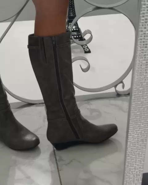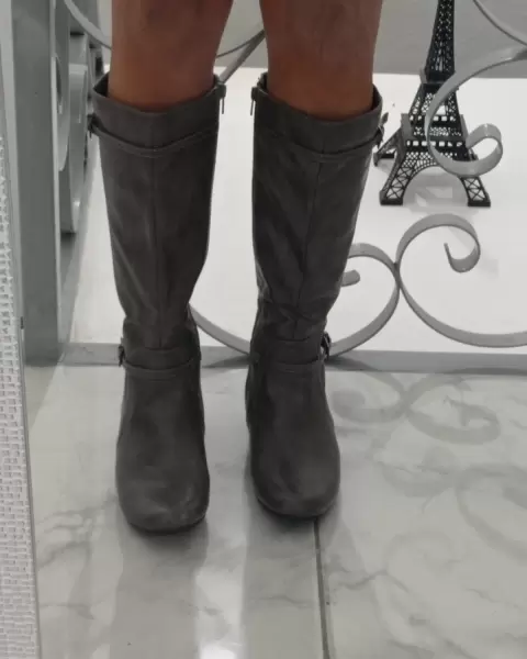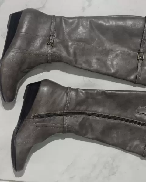 Botas en color gris, tacon de 3 cm, muy cómodas, con detalles de cintillos, elástico oculto n la parte de la pantorilla