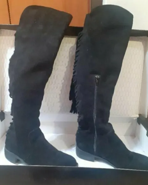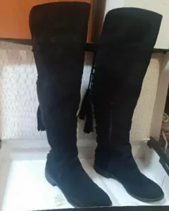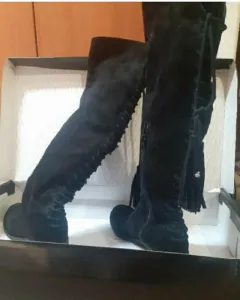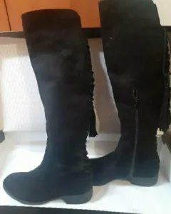 Botas largas negras, tipo gamuza con agujetas que ajustan en la parte trasera de la pierna, de piso, muy cómodas y elegantes.