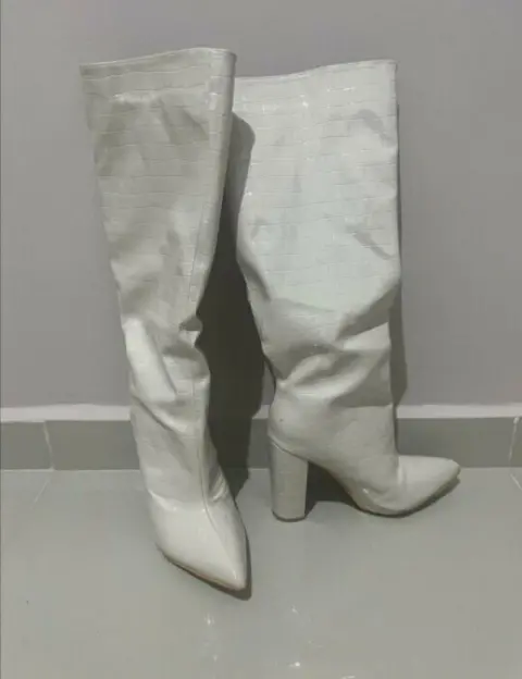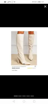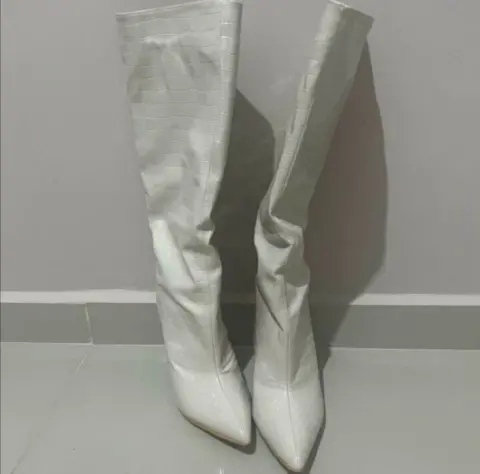 Botas largas blancas. otas beige estilo cocodrilo abajo de la rodilla sin cierre. Quedan lindas con cualquier tipo de outfit. El tacón es súper cómodo aún cuando no usas tacones. Vienen de calidad y están prácticamente nuevas las compre y no me quedan del chamorro lo tengo muy gordito del pie vienen fiel a su talla . Están en excelente estado.