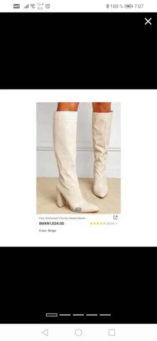 otas beige estilo cocodrilo abajo de la rodilla sin cierre. Quedan lindas con cualquier tipo de outfit. El tacón es súper cómodo aún cuando no usas tacones. Vienen de calidad y están prácticamente nuevas las compre y no me quedan del chamorro lo tengo muy gordito del pie vienen fiel a su talla . Están en excelente estado.