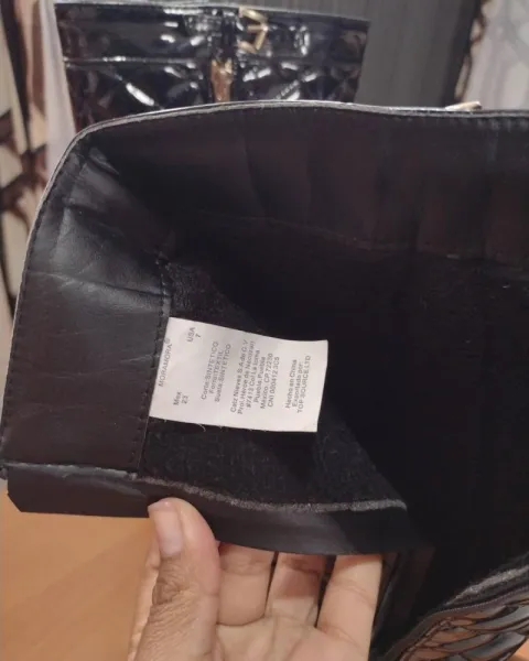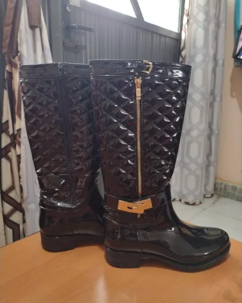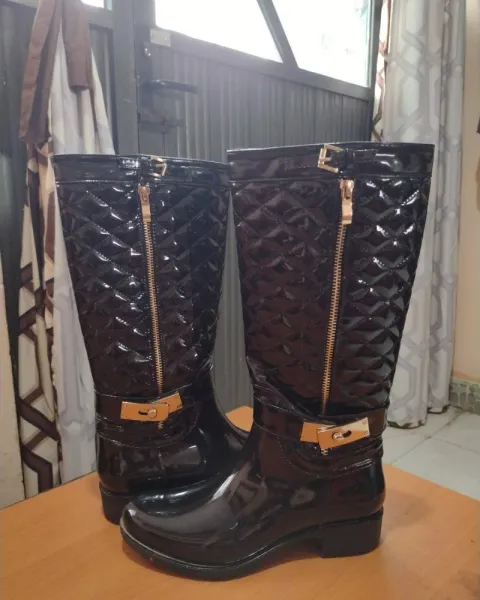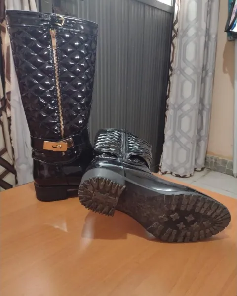 Lindas botas largas para lluvia con detalles en color dorado super padres traen su forro por dentro para más comodidad quedan bien con cualquier outfit ya que no son lisas y eso las asé ver casuales están lindísimas además el color va con todo.