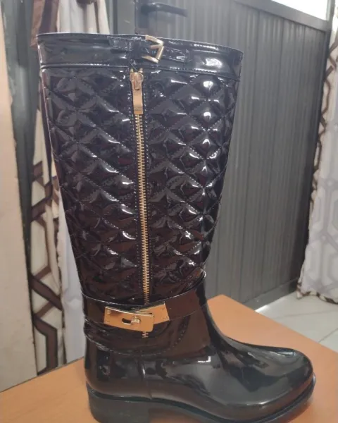 Botas largas de lluvia. Lindas botas largas para lluvia con detalles en color dorado super padres traen su forro por dentro para más comodidad quedan bien con cualquier outfit ya que no son lisas y eso las asé ver casuales están lindísimas además el color va con todo.