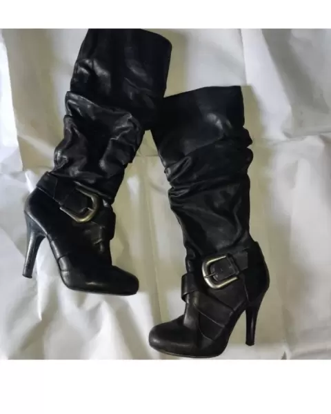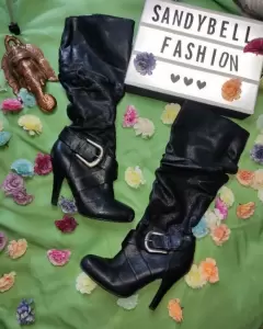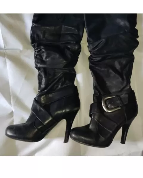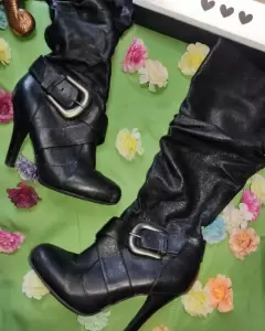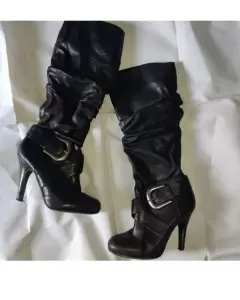 Hermosas botas en color negro a la rodilla en perfecto estado, solo se le tiene que poner tapitas al tacón, con un estilo peculiar que son sus Hebillas y tipo de tacón que las hacer lucir excelente.♡♡♡envío todos los días de lunes a sábado♡♡♡