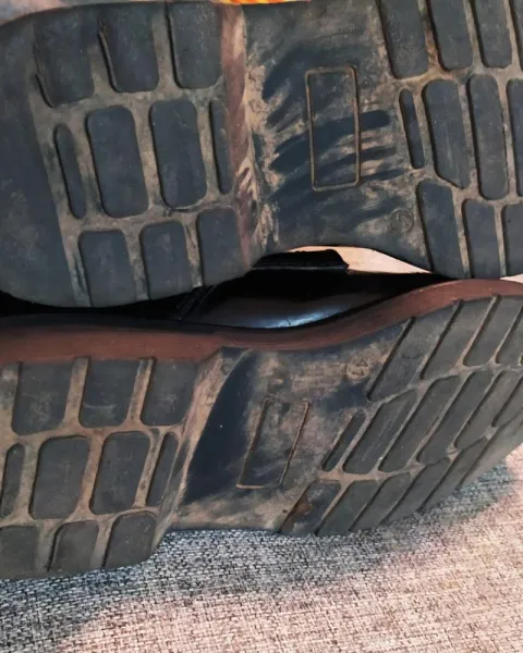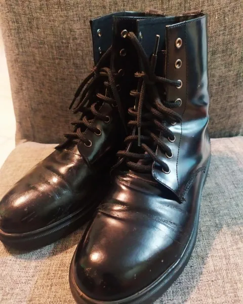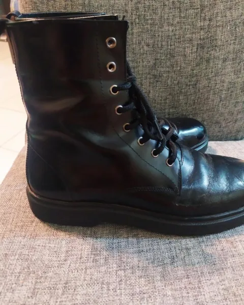 Botas sintéticas. Padrísimos y súper rudos botines estilo militar comprados en Los Ángeles , son hechos en la India , son de piel vegana. ojo tiene un raspones cómo se pueden ver en las fotos pero son superficiales y realmente por el tipo de bota no se ven mal pues son rudas, pero por eso el precio.. Se sienten muy pesadas de Gran calidad. Del número 6