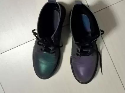 Botas tornasol de agujetas negras. Diseño de bota negro a simple vista, con reflejos tornasol, talla 24, con suela negra