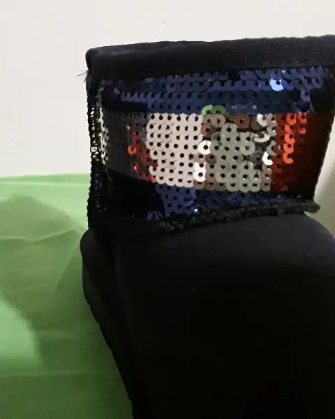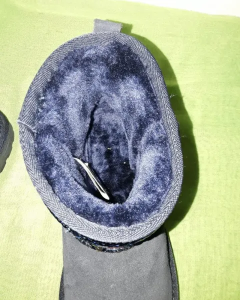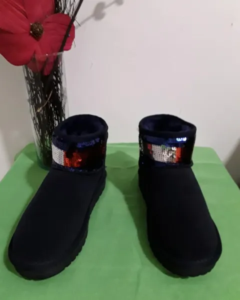 Botines azul marinoTiene diseño de lentejuelasSon súper calientitos y cómodosNum 4.5. Sin etiqueta pero si con precio y código de barras.NuevosEs color azul marino
