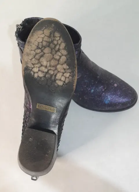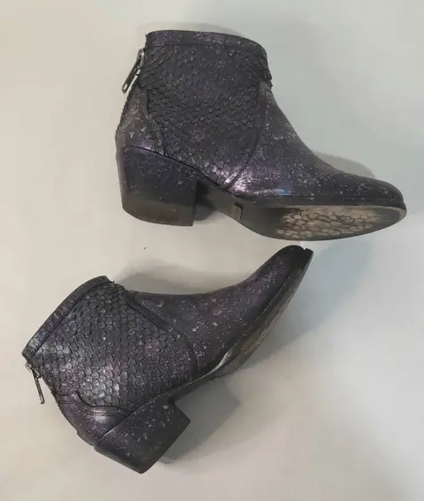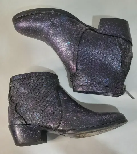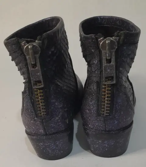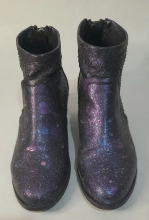 Botines para dama, seminuevos, marca BALA DI GALA, al tobillo, número 24, multicolor en tonos negro, morado y rosa, corte y forro 100% piel, con zipper en la parte don talón, el jaspeado está 100% hecho a mano y abarca todo el corte, el tacón y el zipper.
