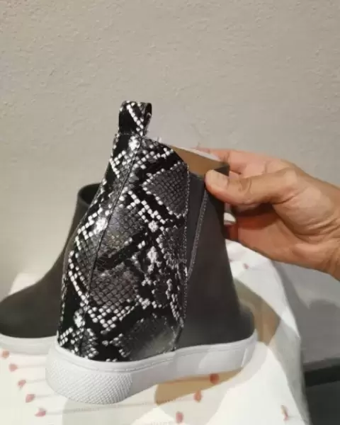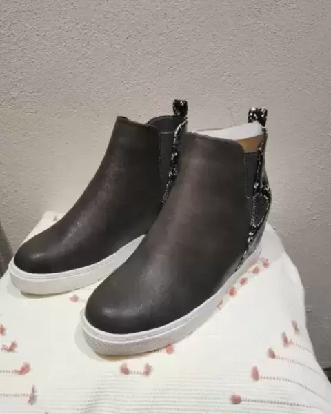Hermoso botín con cuña oculta, detalle de piel de víbora en la parte trasera del calzado, cómodos y modernos.. Nuevos con su caja