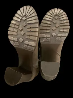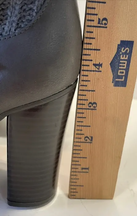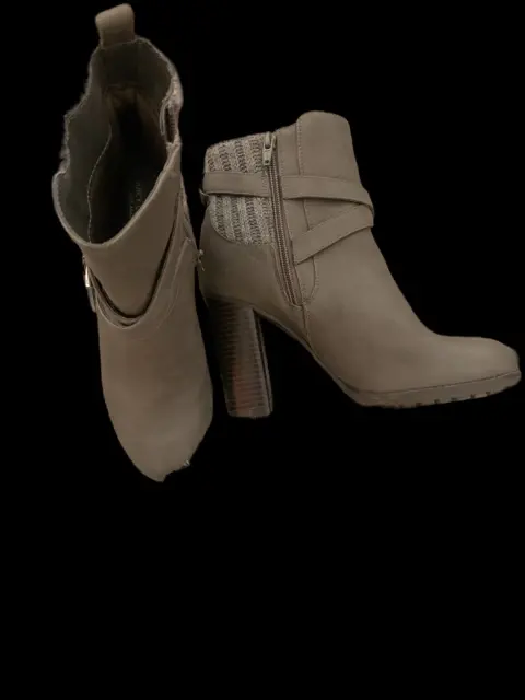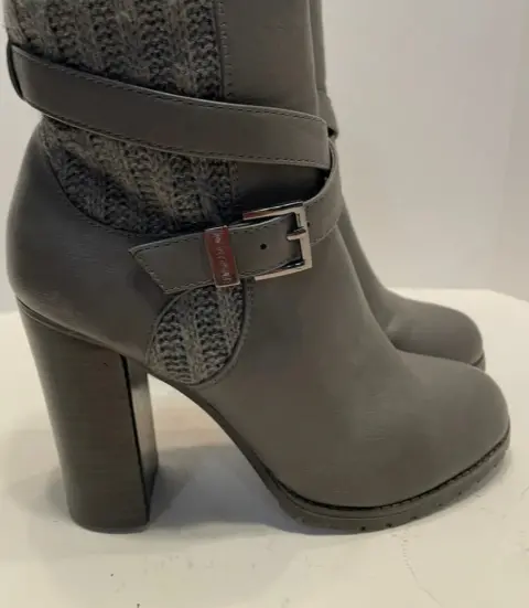 Botas al tobillo , en un lado con tejido imitando un suéter tacón de 10cm color gris obscuro con cierre aún lado detalle solo en la orilla del tacón num 4 5 o num 7.5 en americano