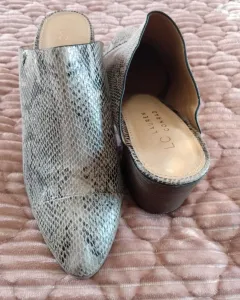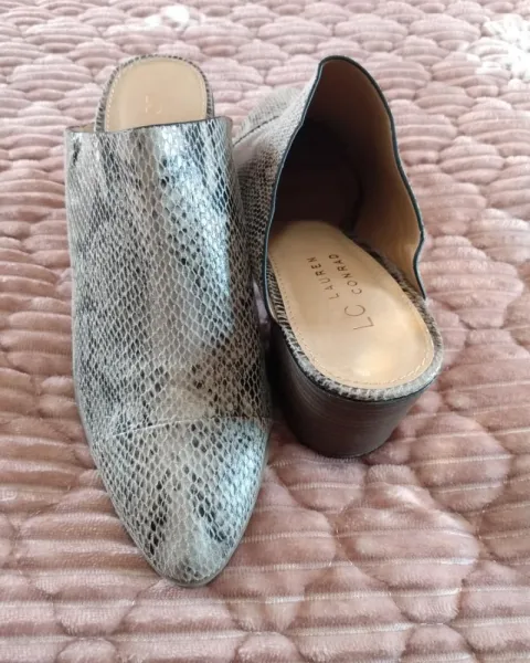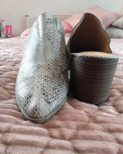 Botín abierto. Muy bonitos pronto vivora, tacón muy cómodo cuadrado de 7 centímetros de alto, la talla dice 8M americano, yo creo será 4/5 mexicano, trae un ligero detalle por fuera el la suela, no afecta en nada su uso.