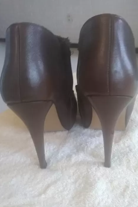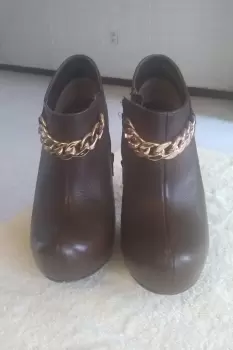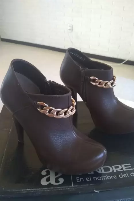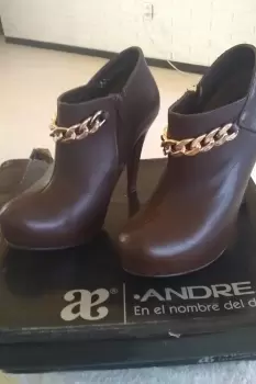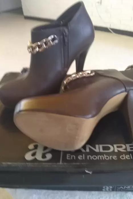Moderno botín al tobillo de la marca Andrea en color café obscuro, del número 25, corte sintético, forro sintético, suela sintética, tacón 12 cms, solo los use 3 veces, excelentes condiciones, solo tienen un detalle en el tacón y en la punta del botín izquierdo, prácticamente imperceptible este último, como se puede ver en las fotos, se entrega como se ve en las fotos, el costo normal en tienda es de $ 1,100.00, se venden en $ 400.00