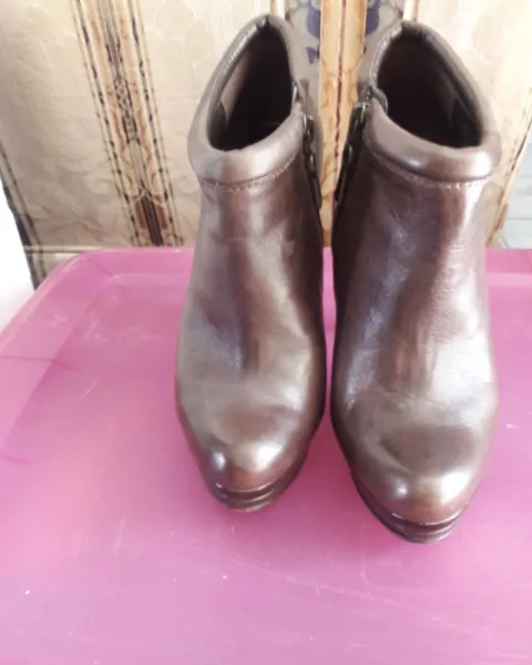 Botin de piel marca dionella, color cafe, tacon de aguja, talla 4.Están super padres! Animate!!