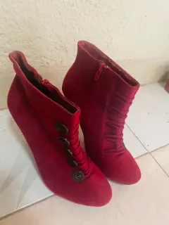 Botín, tipo gamuza, color rojo, son muy cómodos el tacón es número. 10 la talla es 25, tiene cierre para que pueda entrar con facilidad, solo se usaron 3 veces. Están en buen estado.