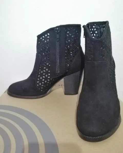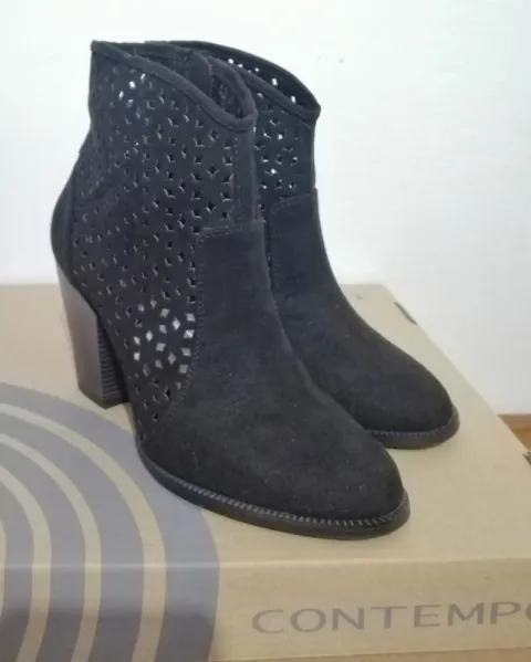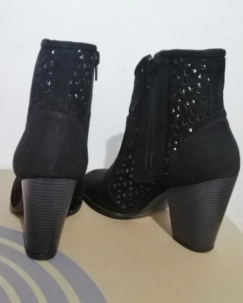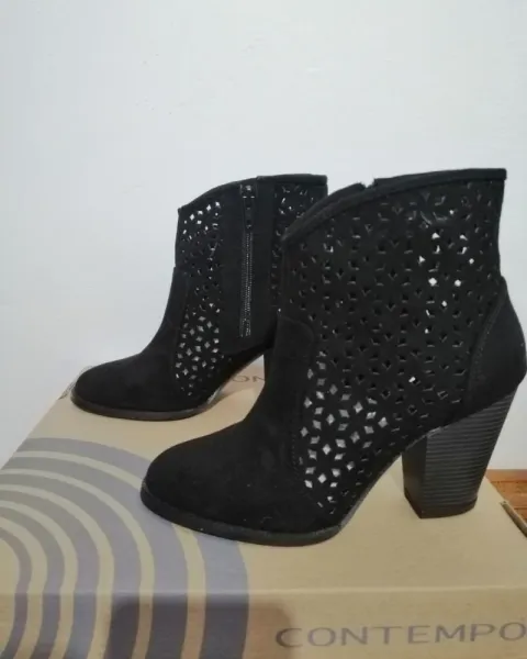 Botín negro gamuza. Botín negro gamuza, marca Contempo. Perforaciones y sierre lateral. Tacón 7 cm