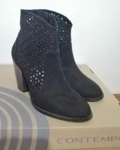Botín negro gamuza, marca Contempo. Perforaciones y sierre lateral. Tacón 7 cm