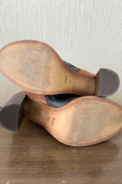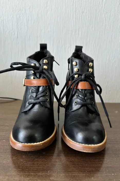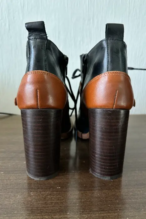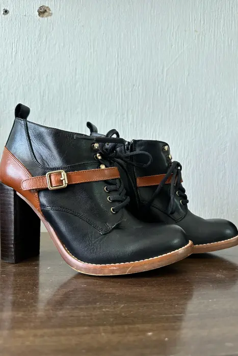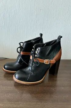 botin de piel estilo clasico, negro con color camel y agujetas, son muy comodos y casuales, el tacon ancho te da mayor confort, estan practicamente nuevos, se pisaron solo en casa para probarlos.