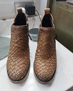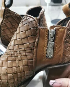 Botín de piel, color caramelo. Tacón cubano. Punta redonda. Siper interior. Número 3.5
