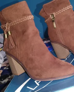 Bonitos botines cafés de tacon ancho el tacon mide aproximadamente 9 cmmuy comodos estan pisados muy leve solo se usaron una vez y muy pocoSe entregan en caja resiclada y con regalito sorpresa
