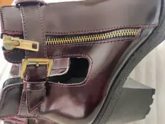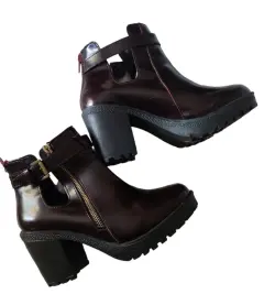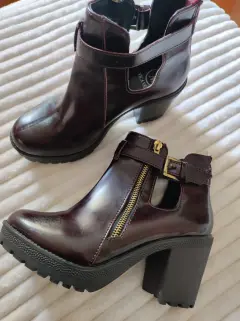 Botines color vinoDetalle de cierre dorado y correa sobre el talónMaterial sintético tipo piel