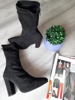Botines de gamuza. Padrísimo modelo de Botin en color negro de gamuza elastizada con tacón de 8 cm de altura. De caña larga y punta que estiliza y define la silueta. Puedes usarla de día o noche con tus prendas favoritas. Ideales para la siguiente temporada 🍁🍂