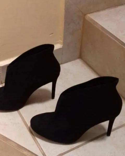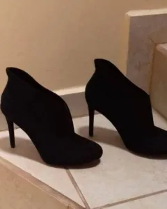 Botines de tacón negro de gamuza, cómodos, con número de tacón de 8cm y la plataforma menos de 1 cm y en perfecto estado.Muy cómodos. Estoy a sus órdenes.