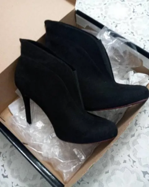 Botines de gamuza de color negro. Botines de tacón negro de gamuza, cómodos, con número de tacón de 8cm y la plataforma menos de 1 cm y en perfecto estado.Muy cómodos. Estoy a sus órdenes.