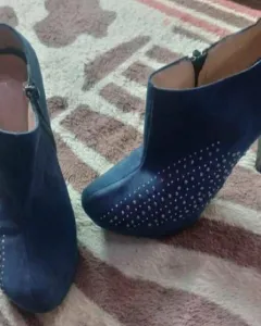 Botines de gamuza con detalle lateral en pedrería, tacón de 12 cms, cómodos. Poco uso.