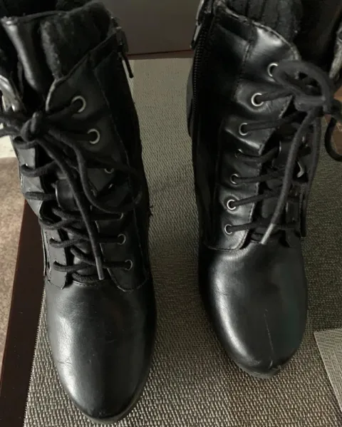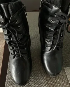 Botines de tacón con suela de goma, muy cómodos, con cierre a los lados, tienen un pequeño detalle, ligera raspadura en la punta pero casi no se nota
