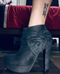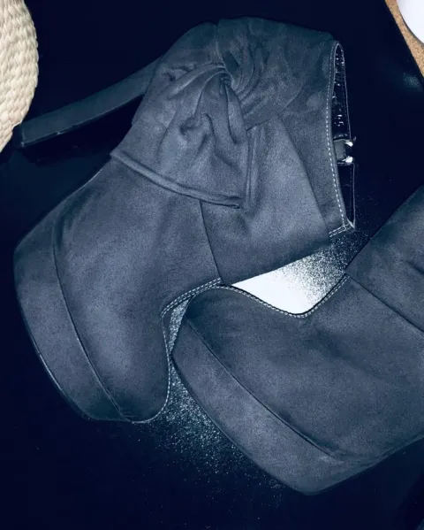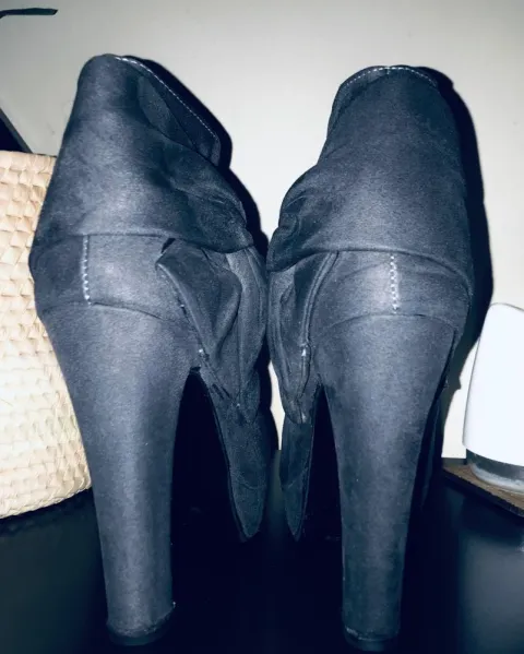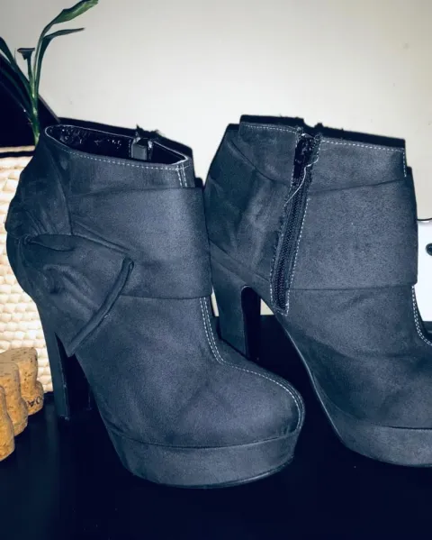 Lindos botines gris oxford tipo gamuza. Talla 24 1/2, altura: 13 cm. Están en muy buen estado y se ven increíbles con jeans, faldas o vestidos.