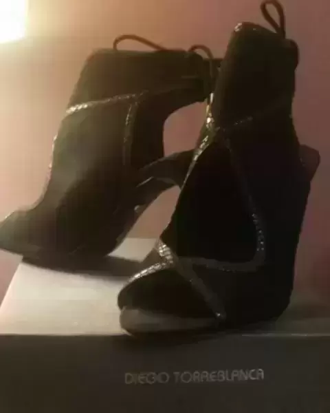 Botines increíbles Nubuck negros. Marca : Diego TorreblancaTextura : Nubuck con ribete de imitación piel víbora.Color : NegroTacón : 12 cms.Detalle de cintas con herraje doradoSe entrega sanitizadoTiene caja de zapatos original