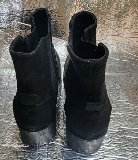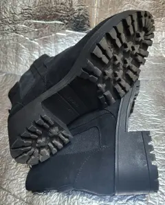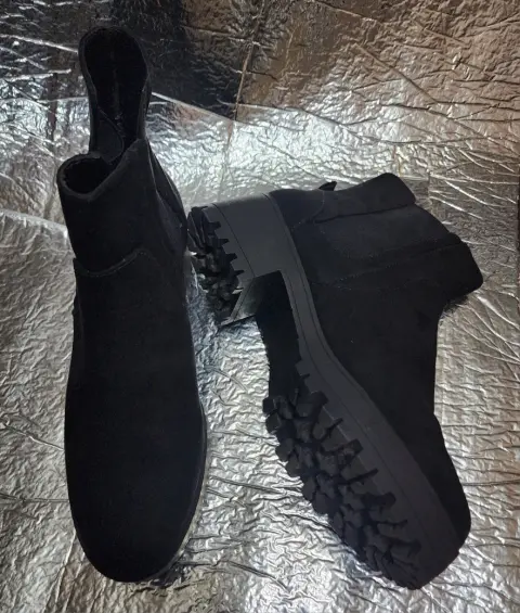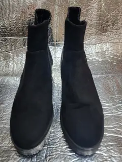 Botines planos con elásticos. Color negroCorte GamuzaSuela 100% caucho termoplastico Marca BERSHKATalla 24.5 (EU 38)Altura tacón 5 cmAltura plataforma 2.5 cmSeminuevos, excelentes condiciones