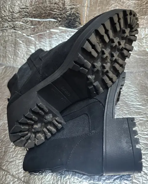Color negroCorte GamuzaSuela 100% caucho termoplastico Marca BERSHKATalla 24.5 (EU 38)Altura tacón 5 cmAltura plataforma 2.5 cmSeminuevos, excelentes condiciones