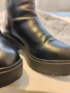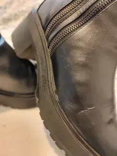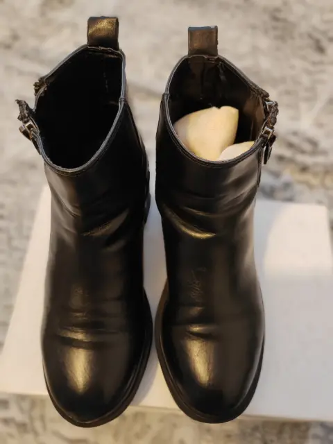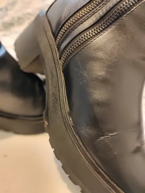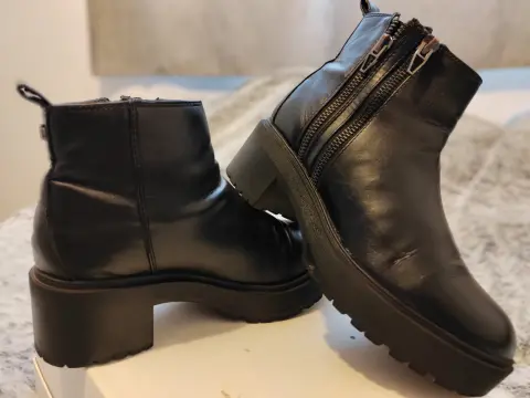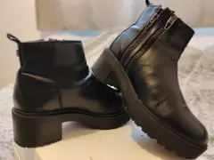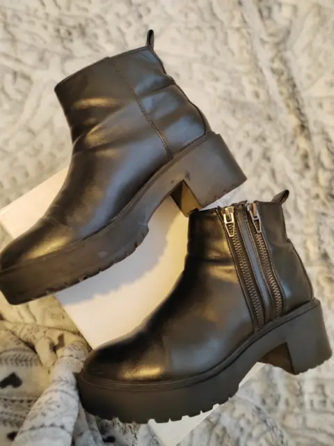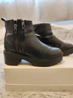 Botines Bershka color negros, suela antideslizante y en perfecto estado,con cierre a los costados. El tacón es bajo y de igual forma está parejo y en buen estado. Talla 35 osea #3Cómo detalles tiene la marca de uso en entrepeine y un mínimo despegado del costado (no afectan su uso ni entra polvo ni agua) 🖤
