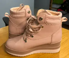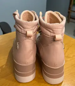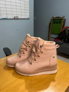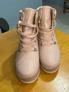 Hermosos botines mora mora color rosa palo, dice 23 pero quedan a 23.5 o 24, están muy cómodos y bonitos, una sola puesta.