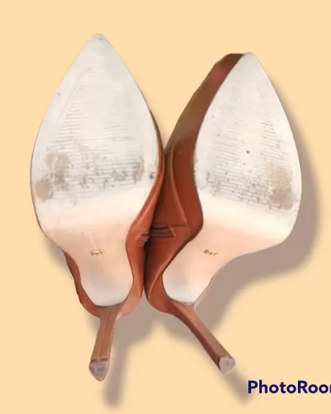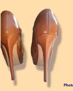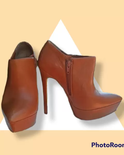 Botines de piel, color miel, tacón de 14 cm. Pocas puestas. Tienen una reparación de pintura por dentro, porque el forro se empezó a descarapelar por estar guardados, pero por fuera están en perfectas condiciones, como si fueran nuevos.