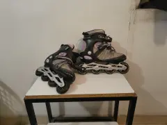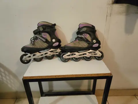 Patines de mujer de línea, usados pero en perfecto estado, color negro con lila, talla 26.5 pero queda bien al 25