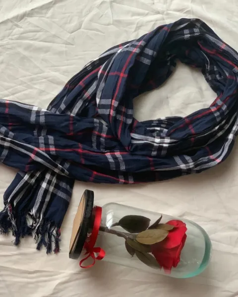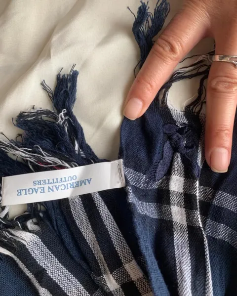 Bufanda de cuadros azul AE. Padrisima bufanda AE en tono azul con cuadros blancos y rojo, ideal para un atuendo invernal o de otoño 🍁 súper combinable !
