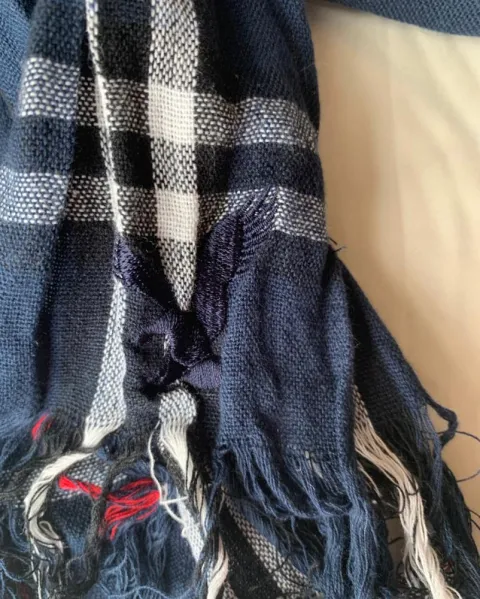 Padrisima bufanda AE en tono azul con cuadros blancos y rojo, ideal para un atuendo invernal o de otoño 🍁 súper combinable !