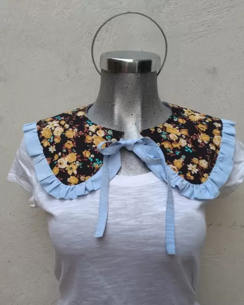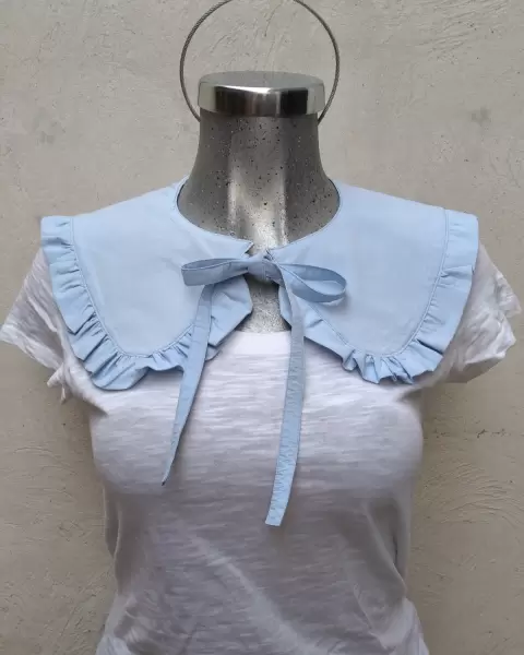 Hermoso cuello bobo artesal doble vista de un lado completamente azul cielo y del otro floriado con olan y cordones azul cielo un lindo toque para tu blusa,sueter o vestido