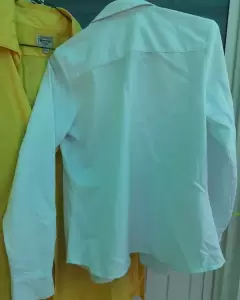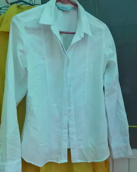 Camisa blanca, botones cubierto, acinturada, escote lindo es gruesa, genial para época de frío