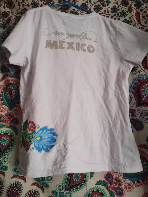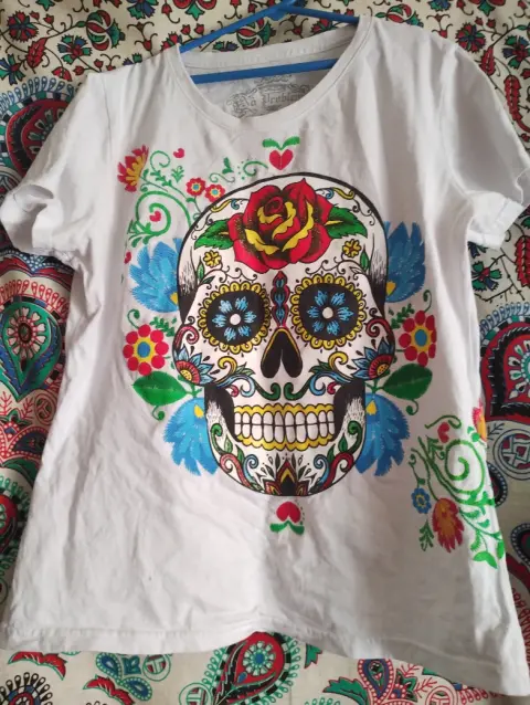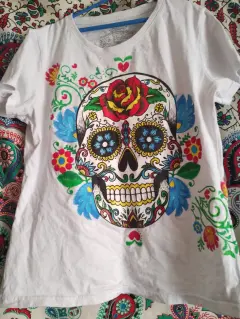Blusa calaca. Blusa blanca con bellos colores. No tiene detalles. Talla G. Tela fresca.