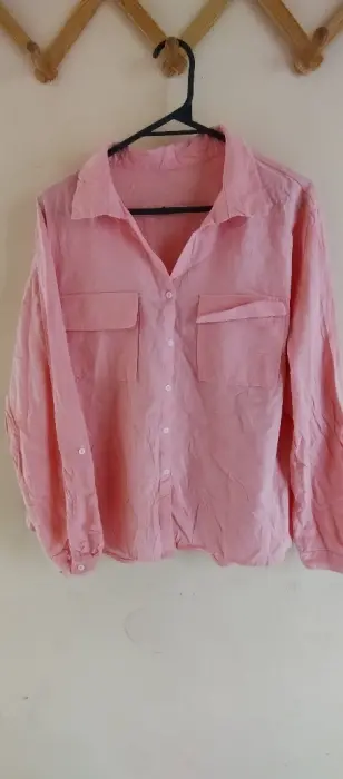 Blusa camisera. Blusa camisera, color rosa pétalo, Talla XXL, 70% algodón, 30% flax, corte redondeado en la parte de abajo, mangas largas ajustable a 3/4 con una jareta y botón. Bolsillos delanteros funcionales.
